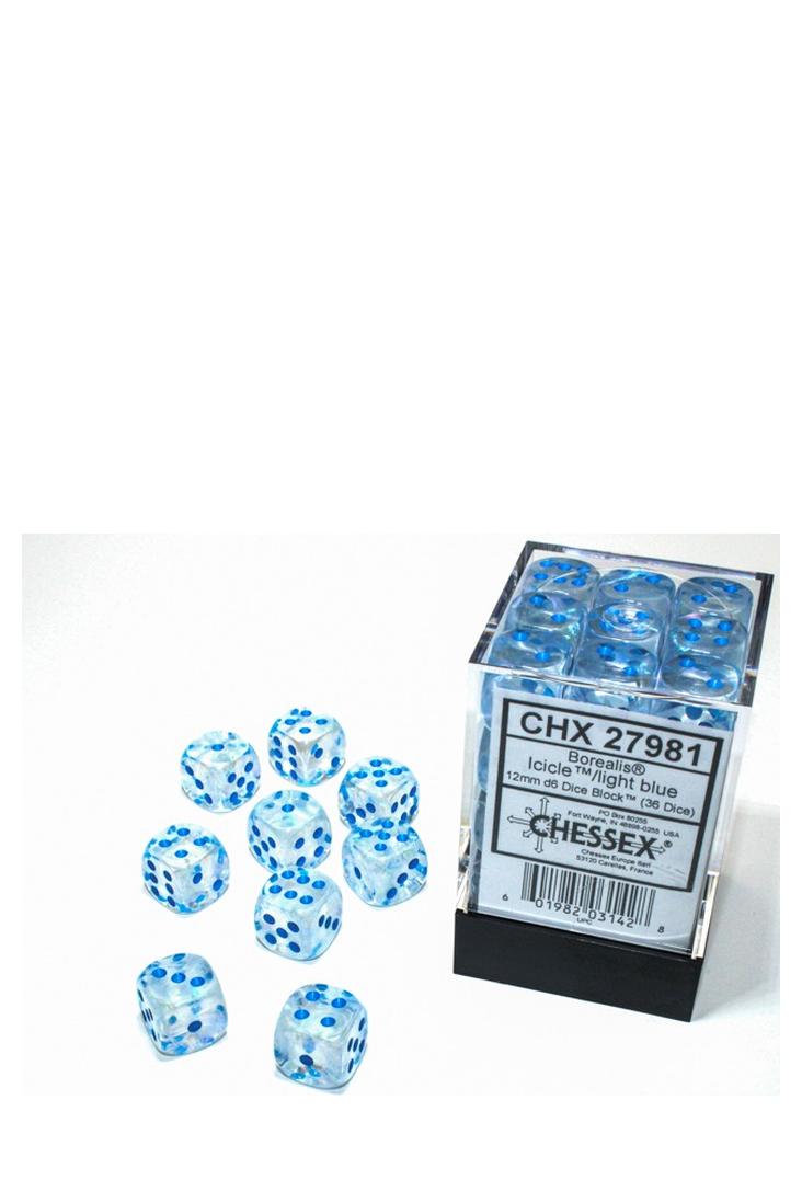 Produktspezifikationen zu 36er-Pack 12mm D6 Würfel - Borealis Icicle / Light Blue (Luminary) von Chessex: