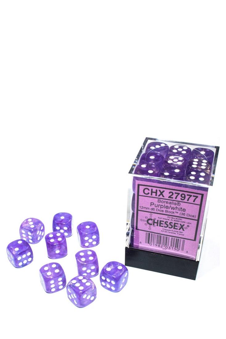 Produktspezifikationen zu 36er-Pack 12mm D6 Würfel - Borealis Purple / White (Luminary) von Chessex: