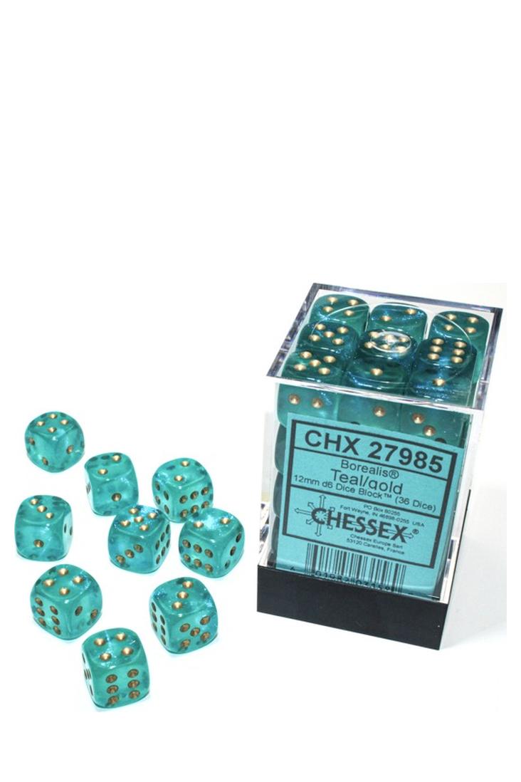 Produktspezifikationen zu 36er-Pack 12mm D6 Würfel - Borealis Teal / Gold (Luminary) von Chessex: