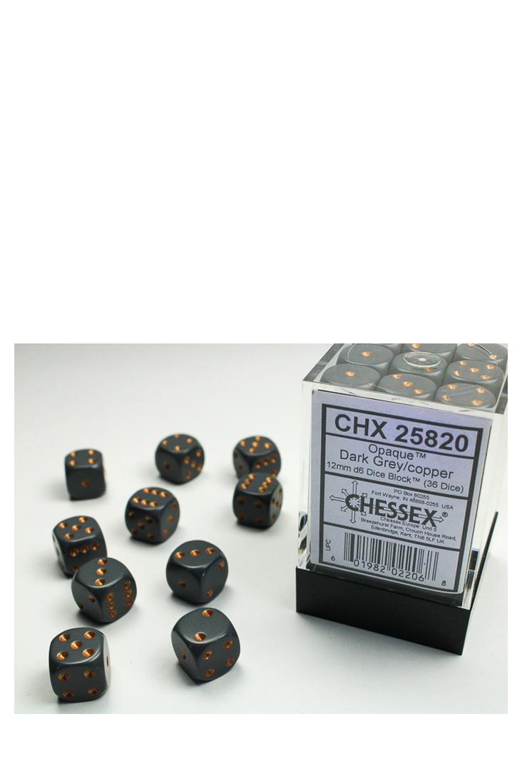 Produktspezifikationen zu 36er-Pack 12mm D6 Würfel - Dunkelgrau / Kupfer von Chessex: