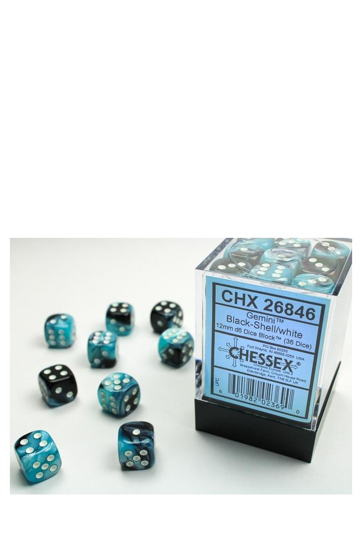 Produktspezifikationen zu 36er-Pack 12mm D6 Würfel - Gemini Black-Shell / White von Chessex: