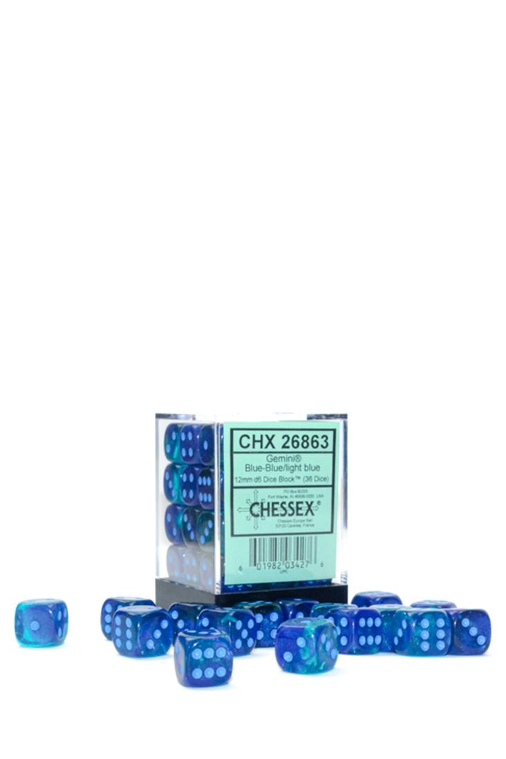 Produktspezifikationen zu 36er-Pack 12mm D6 Würfel - Gemini Blue-Blue / Light Blue (Luminary) von Chessex: