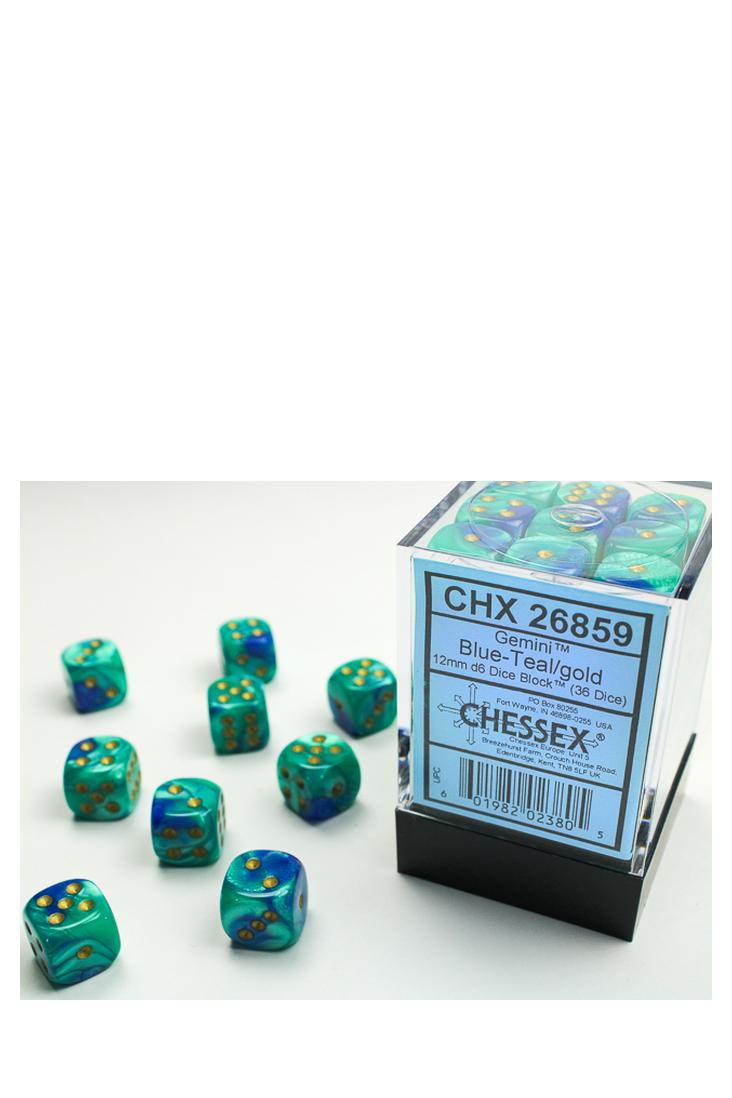 Produktspezifikationen zu 36er-Pack 12mm D6 Würfel - Gemini Blue-Teal / Gold von Chessex: