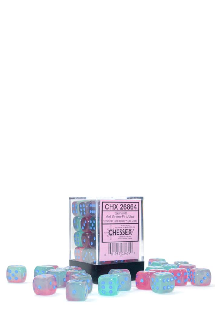 Produktspezifikationen zu 36er-Pack 12mm D6 Würfel - Gemini Gel Green-Pink / Blue (Luminary) von Chessex: