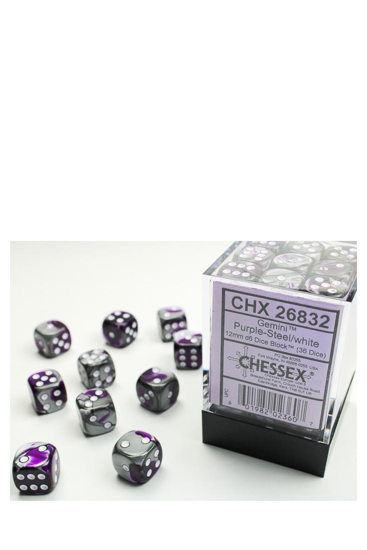 Produktspezifikationen zu 36er-Pack 12mm D6 Würfel - Gemini Purple-Steel / White von Chessex: