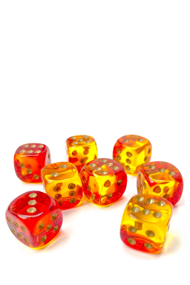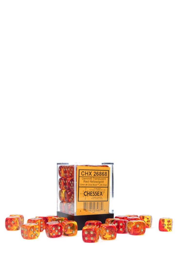 Produktspezifikationen zu 36er-Pack 12mm D6 Würfel - Gemini Translucent Red-Yellow / Gold von Chessex: