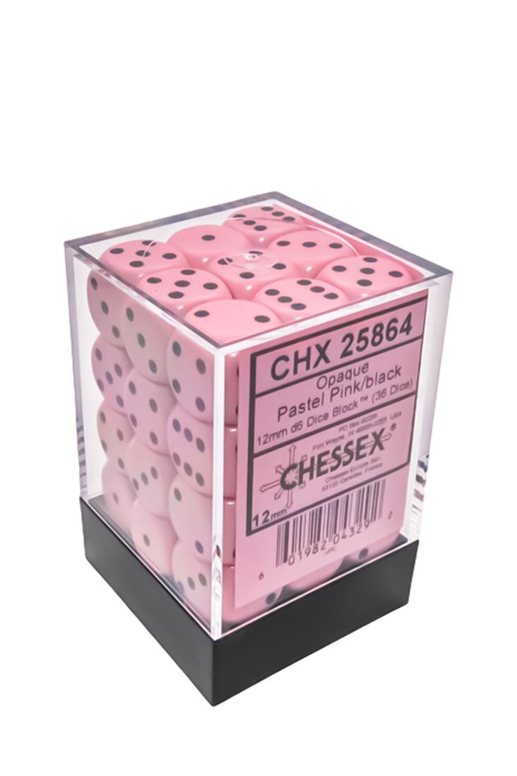 Produktspezifikationen zu 36er-Pack 12mm D6 Würfel - Pastellrosa / Schwarz von Chessex: