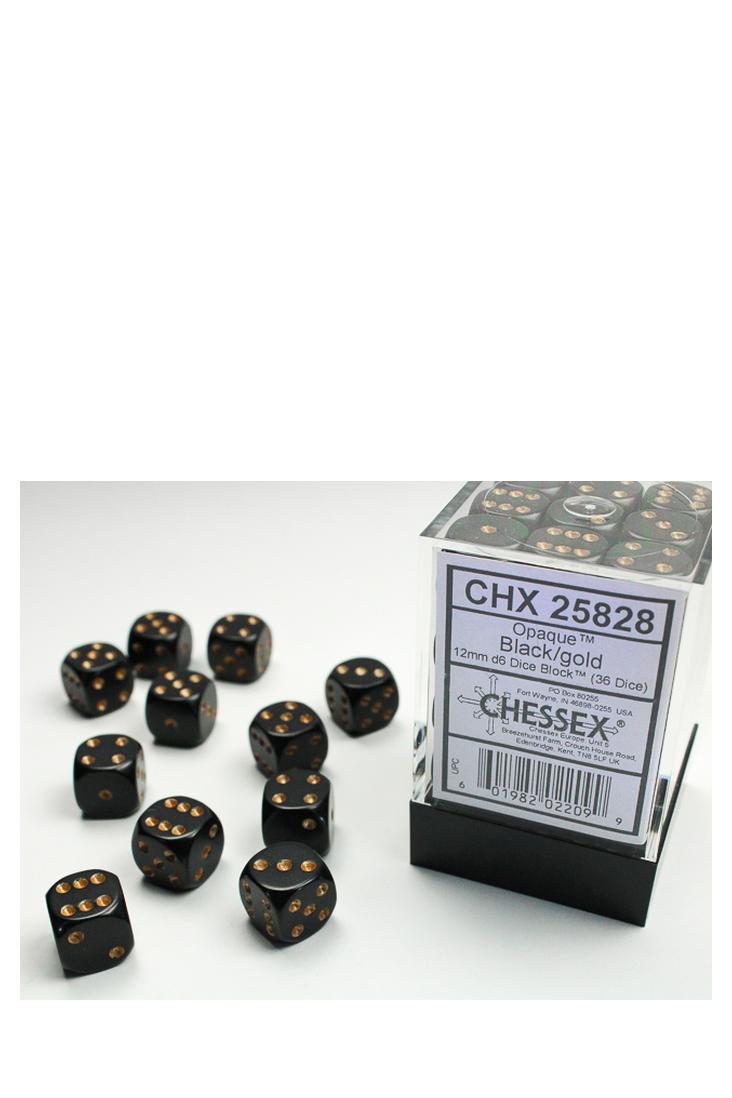 Produktspezifikationen zu 36er-Pack 12mm D6 Würfel - Schwarz / Gold von Chessex: