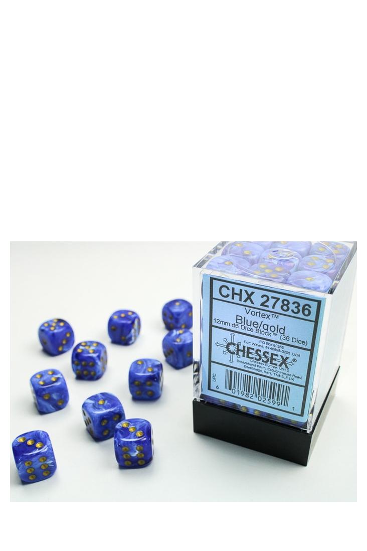 Produktspezifikationen zu 36er-Pack 12mm D6 Würfel - Vortex Blue / Gold von Chessex: