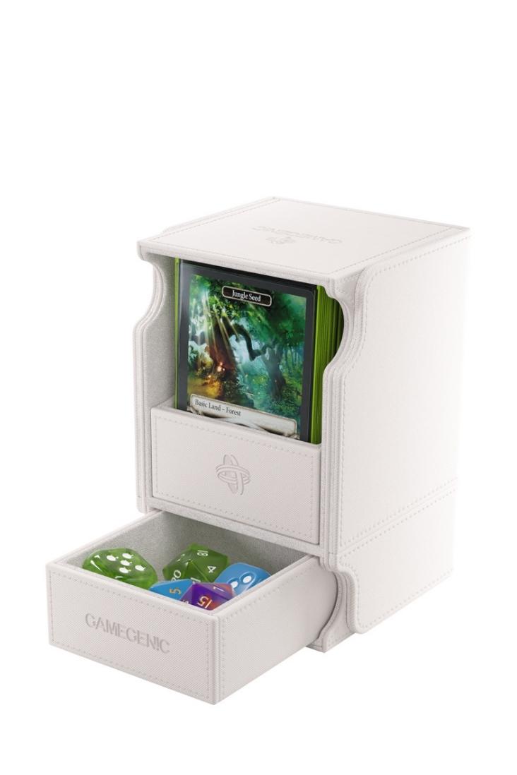 Diese extra grosse Variante des Watchtower 100+ fasst 100 herkömmliche, doppelt gesleevte Karten und bietet ausserdem ausreichend Raum für zusätzliche Tokens. Alternativ findet aber auch ein Commander-Deck in dickeren Innen Sleeves perfekt Platz darin. Die Zubehörschublade ist zudem perfekt zur Aufbewahrung von Würfeln, Zählern und anderen kleinen Spielgegenständen geeignet.