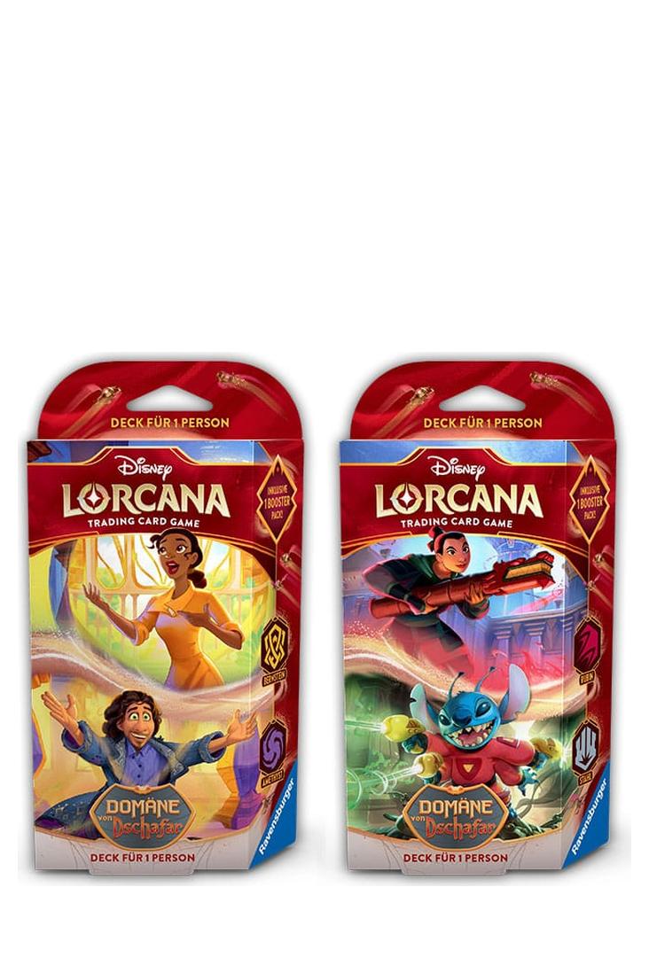 Um Disney Lorcana zu spielen, benötigen alle Mitspielenden ein Deck mit sechzig Karten. Starter Decks enthalten ein vorgefertigtes Deck mit einem festgelegten Kartensatz. Wenn du noch nicht damit vertraut bist, dein eigenes Deck zu bauen, ist das ausgewogene und vom Lorcana Team getestete Starter Deck die ideale Basis.