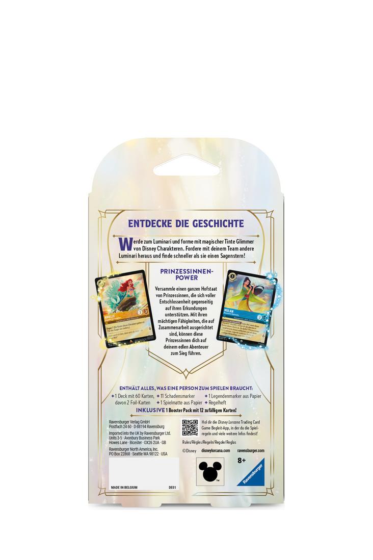 Um Disney Lorcana zu spielen, benötigen alle Mitspielenden ein Deck mit sechzig Karten. Starter Decks enthalten ein vorgefertigtes Deck mit einem festgelegten Kartensatz. Wenn du noch nicht damit vertraut bist, dein eigenes Deck zu bauen, ist das ausgewogene und vom Lorcana Team getestete Starter Deck die ideale Basis.