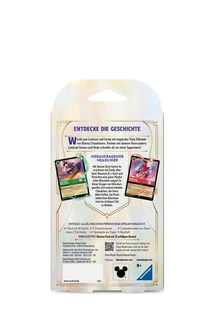 Um Disney Lorcana zu spielen, benötigen alle Mitspielenden ein Deck mit sechzig Karten. Starter Decks enthalten ein vorgefertigtes Deck mit einem festgelegten Kartensatz. Wenn du noch nicht damit vertraut bist, dein eigenes Deck zu bauen, ist das ausgewogene und vom Lorcana Team getestete Starter Deck die ideale Basis.