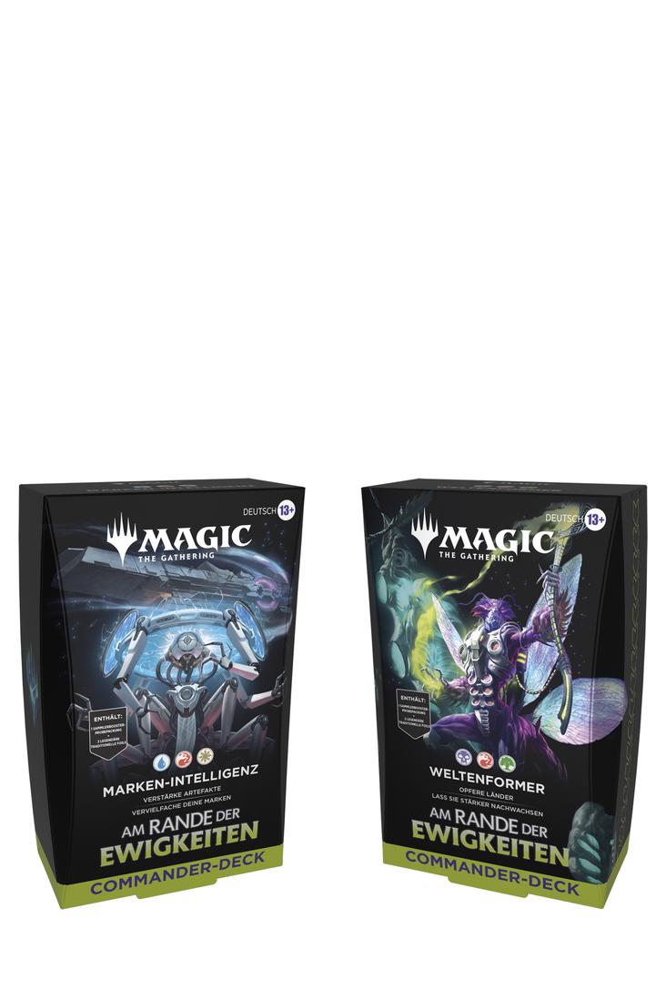 Dieses Bundle enthält beide Am Rande der Ewigkeiten Commander-Decks – Weltenformer und Marken-Intelligenz.
