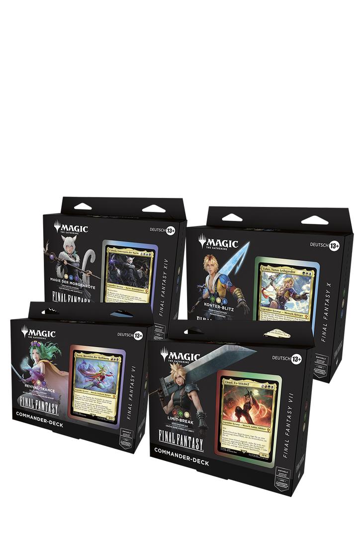 Dieses Bundle enthält alle 4 Final Fantasy Commander-Decks – Revival-Trance, Limit-Break, Konter-Blitz und Magie der Morgenröte.