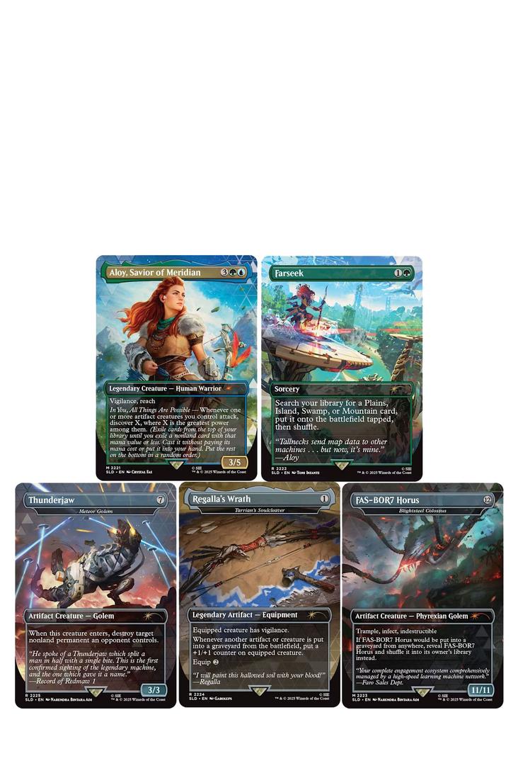 Neben einer brandneuen Magic-Karte, die die grösste Maschinenjägerin der Welt selbst zeigt, präsentiert der Secret Lair x Horizon: Into the Forbidden West Drop auch die beeindruckenden kolossalen Maschinen, für die die Serie bekannt ist. Blicke mit Farseek aus der Langhals-Perspektive herab, spiele einen Blightsteel Colossus als die uralte Kriegsmaschine „FAS-BOR7 Horus“ oder einen Meteor Golem als „Thunderjaw“. Und mit Tarrian's Soulcleaver als der Bogen „Regalla's Wrath“, den Aloy bei der Kulrut gewonnen hat, kannst du sicher sein, dass die Retterin von Meridian für die Reise in den Verbotenen Westen voll ausgerüstet sein wird.