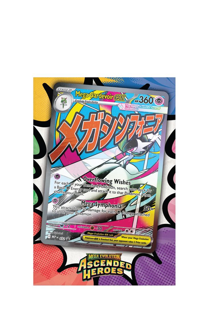 Mit starken Attacken und hohen KP sind Mega-Lucario-ex (Mega Lucario ex) und Mega-Guardevoir-ex (Mega Gardevoir ex) im Kampf keine Grenzen gesetzt! Verbünde dich mit einem dieser mächtigen Mega-Entwicklungs-Pokémon-ex, das dich hier als holografische Vollbild-Promokarte erwartet, und entdecke danach noch mehr Pokémon in den 10 enthaltenen Boosterpacks der Erweiterung Mega-Entwicklung – Erhabene Helden (Mega Evolutions – Ascended Heroes). Du erhältst ausserdem ein grosses Poster mit Mega-Lucario oder Mega-Guardevoir und anderen Pokémon aus dieser besonderen Erweiterung.