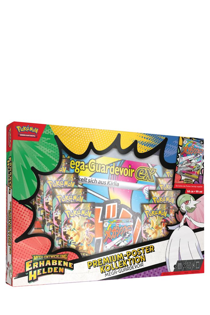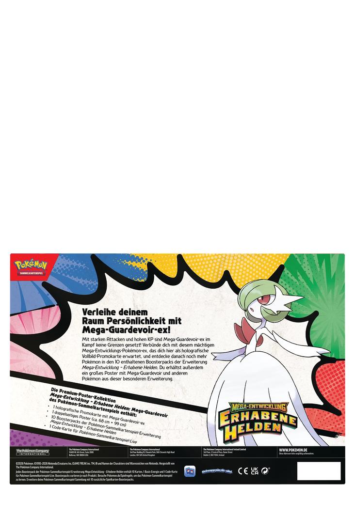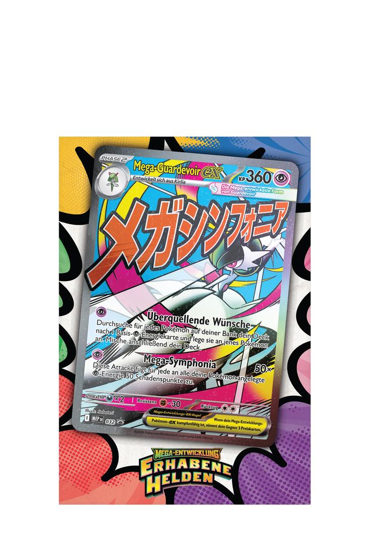 Mit starken Attacken und hohen KP sind Mega-Lucario-ex (Mega Lucario ex) und Mega-Guardevoir-ex (Mega Gardevoir ex) im Kampf keine Grenzen gesetzt! Verbünde dich mit einem dieser mächtigen Mega-Entwicklungs-Pokémon-ex, das dich hier als holografische Vollbild-Promokarte erwartet, und entdecke danach noch mehr Pokémon in den 10 enthaltenen Boosterpacks der Erweiterung Mega-Entwicklung – Erhabene Helden (Mega Evolutions – Ascended Heroes). Du erhältst ausserdem ein grosses Poster mit Mega-Lucario oder Mega-Guardevoir und anderen Pokémon aus dieser besonderen Erweiterung.