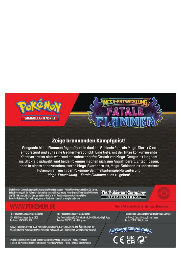 Sengende blaue Flammen fegen über ein dunkles Schlachtfeld, als Mega-Glurak X-ex emporsteigt und auf seine Gegner herabblickt! Eine tiefe, mit der Hitze konkurrierende Kälte verbreitet sich, während die schattenhafte Gestalt von Mega-Gengar-ex langsam ins Blickfeld schwebt, und beide Pokémon machen sich zum Angriff bereit. Entschlossen, ihnen in nichts nachzustehen, treten Mega-Skaraborn-ex, Mega-Schlapor-ex und weitere Pokémon an, um in der Pokémon-Sammelkartenspiel-Erweiterung Mega-Entwicklung – Fatale Flammen (Mega Evolutions – Phantasmal Flames) alles zu geben!