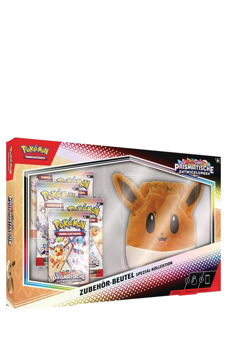 Niedlich, flauschig und voller Charme – Evoli zaubert jedem, dem es über den Weg läuft, ein Lächeln ins Gesicht! Mit dem weichen Zubehör-Beutel aus dieser Kollektion kannst du Evolis Begeisterung überallhin mitnehmen, von der Pokémon-Liga bis hin zu einem Stadtbummel. Evolis grosse Ohren sorgen für einen einzigartigen Look und der Kordelzug an der Oberseite hilft dir dabei, deine Münzen und andere Accessoires sicher aufzubewahren. Ausserdem gibt es Boosterpacks aus der besonderen Erweiterung Karmesin & Purpur - Prismatische Entwicklungen, die für noch mehr Pokémon-Spass sorgen!