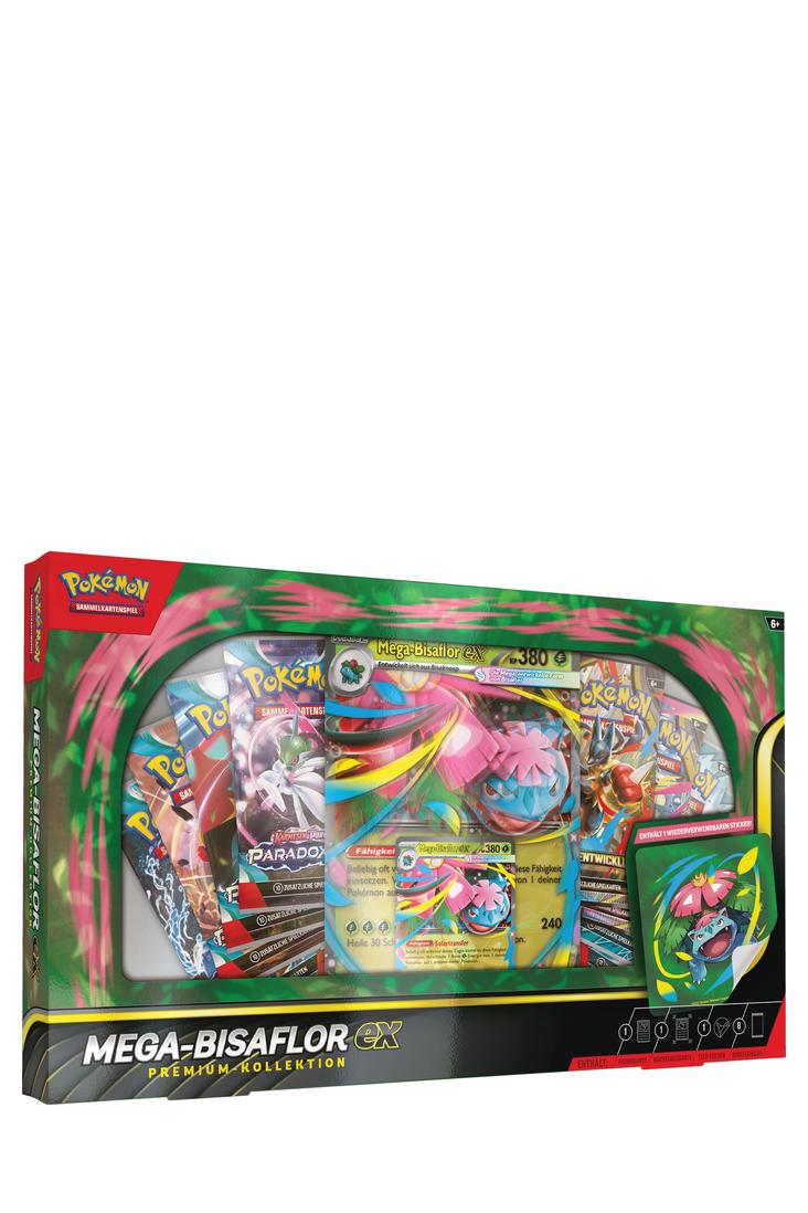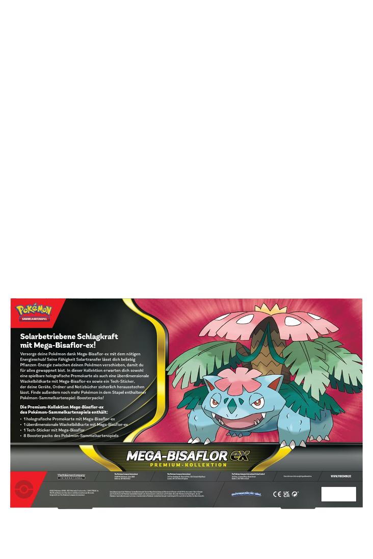 Versorge deine Pokémon dank Mega-Bisaflor-ex mit dem nötigen Energieschub! Seine Fähigkeit Solartransfer lässt dich beliebig Pflanzen-Energie zwischen deinen Pokémon verschieben, damit du für alles gewappnet bist. In dieser Kollektion erwarten dich sowohl eine spielbare holografische Promokarte als auch eine überdimensionale Wackelbildkarte mit Mega-Bisaflor-ex sowie ein Tech-Sticker, der deine Geräte, Ordner und Notizbücher sicherlich herausstechen lässt. Finde ausserdem noch mehr Pokémon in dem Stapel enthaltener Pokémon-Sammelkartenspiel-Boosterpacks!