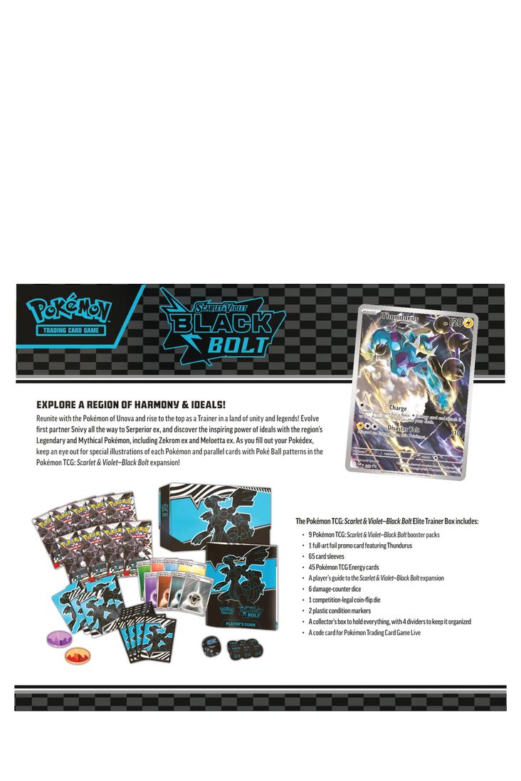 Erforsche eine harmonische Region, feiere das Wiedersehen mit den Pokémon der Einall-Region (Unova) und erklimme im Land der Eintracht und Legenden als Trainer die Spitze! Genau wie die zweigeteilte Erweiterung enthalten die Top-Trainer-Boxen Karmesin & Purpur – Schwarze Blitze (Black Bolt) und Karmesin & Purpur – Weisse Flammen (White Flare) jeweils unterschiedliche Pokémon, die du ausfindig machen kannst. Entdecke die inspirierende Macht der Wünsche und die unbestreitbare Macht der Wirklichkeit mit den Legendären Pokémon der Region, darunter Voltolos (Schwarze Blitze) und Boreos (Weisse Flammen).